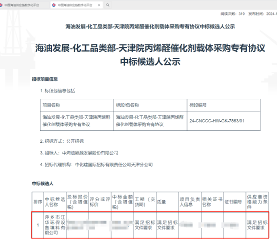 江華環(huán)保中標(biāo)中海油丙烯醛催化劑載體采購項目