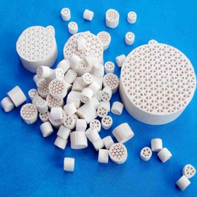 鳥巢支撐劑主要由AL?O?加高嶺土球磨制成粉,經(jīng)捏合機(jī)加入CMC攪拌后擠注、切割、燒結(jié)成型。具有較高的空隙率,能很好的吸附床層中的污垢,更好的氣液分布。