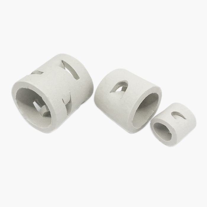 陶瓷鮑爾環(huán)填料是在陶瓷拉西環(huán)的基礎(chǔ)上開發(fā)的一種高徑相等的開孔環(huán)型填料,每層窗孔有5個(gè)舌葉,每個(gè)舌葉內(nèi)彎指向環(huán)心,上下兩層窗孔的位置相反錯(cuò)開,一般開孔面積約占環(huán)壁總面積的30%左右,使得填料塔內(nèi)的氣體和液體能夠從窗孔自由通過(guò),改善了氣液分布,充分利用了環(huán)的內(nèi)表面。