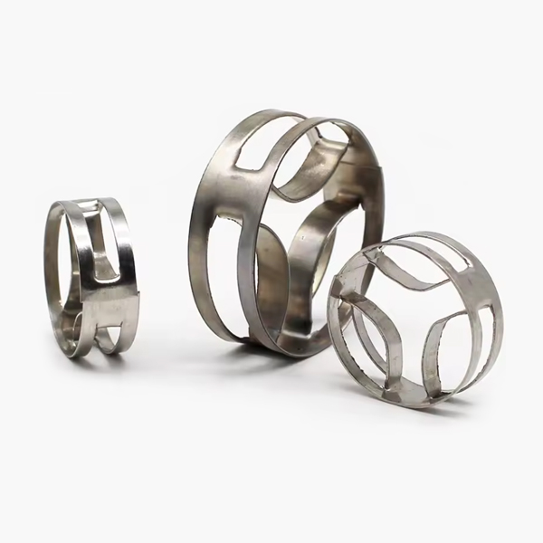 金屬扁環(huán)填料是一種短開孔環(huán)型填料。其高、徑比達(dá)到大約1/3,扁環(huán)填料在結(jié)構(gòu)上與階梯環(huán)相似,取消了階梯環(huán)的翻邊,采用內(nèi)彎弧形筋片來提高填料強度,在亂堆時能有序排列,流道結(jié)構(gòu)合理,壓降低,在處理能力和傳質(zhì)性能上均有所改善。確保填料堆積時統(tǒng)一朝向,增加了堆密度,內(nèi)彎弧筋片使填料層內(nèi)氣液分布更加 均勻,大大提高了分離效果,具有傳質(zhì)交率高、床層阻力低、自理能力大、返混夾帶小、不易結(jié)垢等優(yōu)點。
