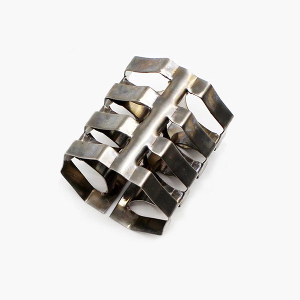 金屬八四內(nèi)弧環(huán)填料,也稱(chēng)麥勒環(huán)填料,是一種新型高效金屬散堆填料,該填料有合理的幾何對(duì)稱(chēng)性,構(gòu)造均勻性好及高的空隙率,八弧卷與四弧圈順軸向交替安排,名弧段沿徑向環(huán)內(nèi)折進(jìn),從而使填料表面連續(xù)而不斷開(kāi),且在空間均勻分布,與鮑爾環(huán)相比,通量可提高15-30%,壓降減小20-30%。