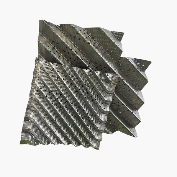 金屬孔板波紋填料是在金屬薄板表面開孔、軋制小紋、大波紋最后組裝而成的規(guī)整填料,具有阻力小、氣液布均勻、效率高、能量大、放大效應(yīng)不明顯等特點(diǎn),應(yīng)用于負(fù)壓、常壓和加壓操作。